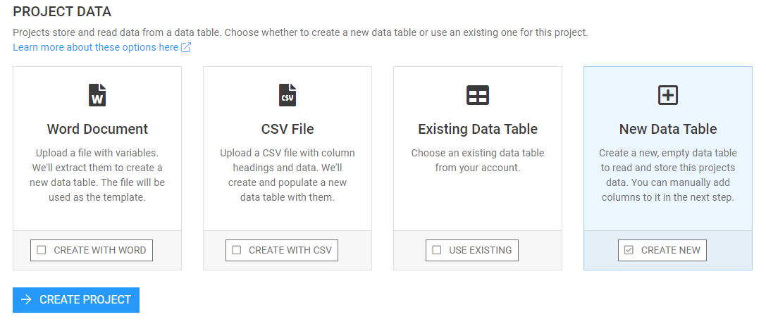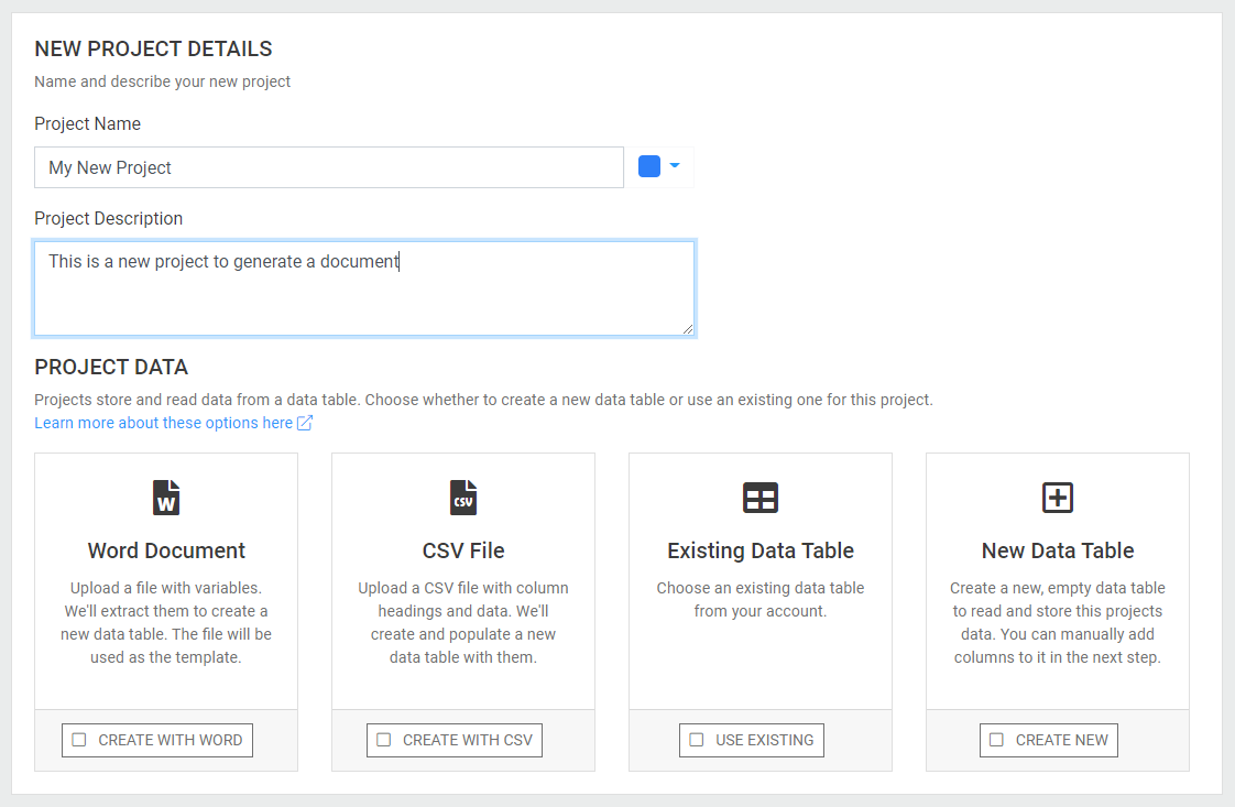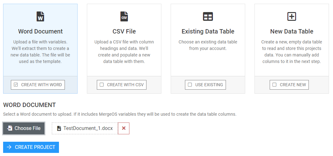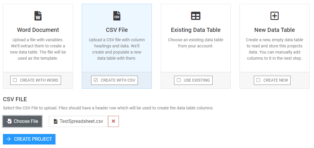 Creating a project from a CSV file will automatically build the data table. In a later step you can upload a Document Template you have already built, and it will be used to generate documents.