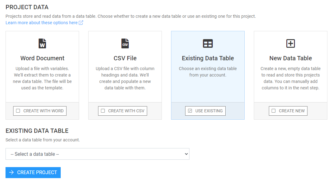 If you already have an existing data table with rows, you can choose this option. You would also use this option if you want to generate multiple files using the same data. You can have two or more projects using the same data table and each can be configured with a different document template, allowing you to generate multiple files at once.